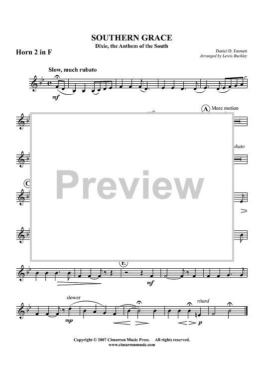 Digital Sheet Music for Southern Grace (Dixie, the Anthem of the South) - Horn 2 by , Traditional, Lewis J. Buckley scored for Brass Ensemble; id:366627