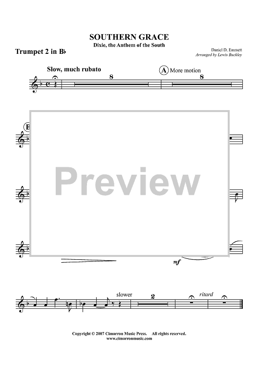 Digital Sheet Music for Southern Grace (Dixie, the Anthem of the South) - Trumpet 2 by , Traditional, Lewis J. Buckley scored for Brass Ensemble; id:366635
