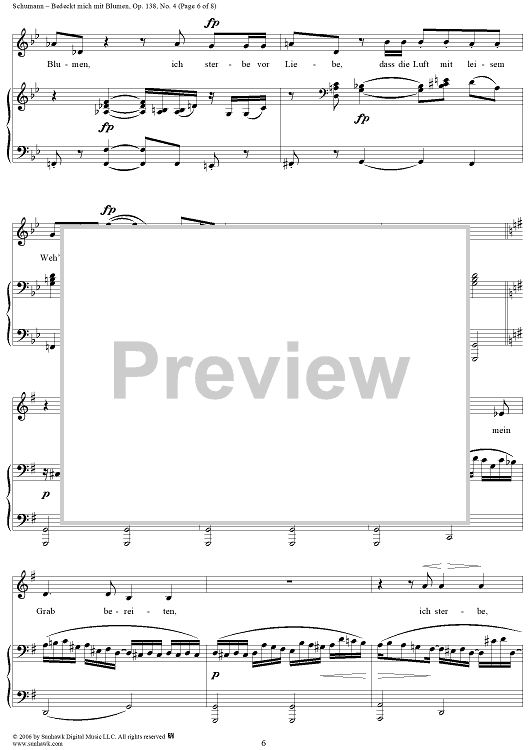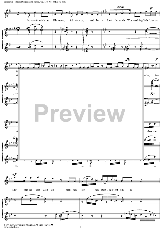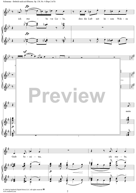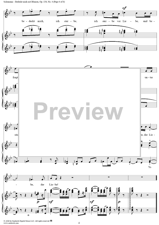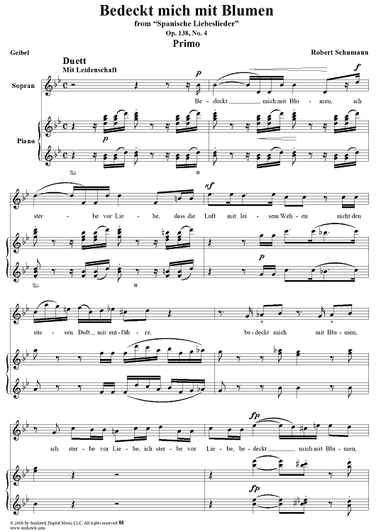 Digital Sheet Music for Spanische Liebeslieder, Op. 138, No. 4: Bedeckt mich mit Blumen by Emanuel Geibel, Robert Schumann scored for Voice/Piano, 4 Hands; id:315698