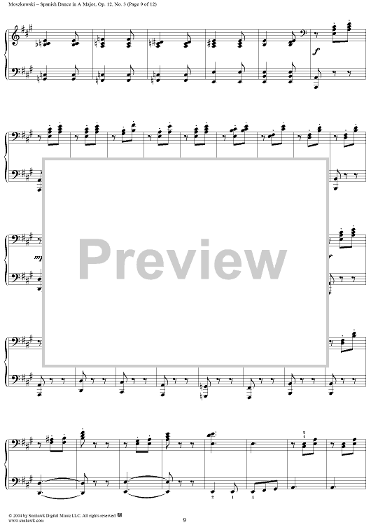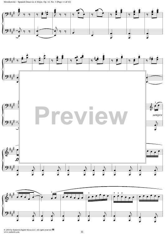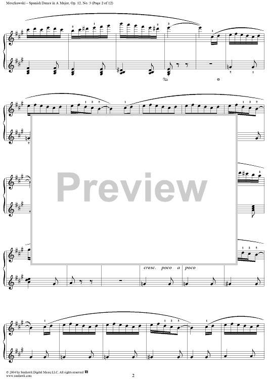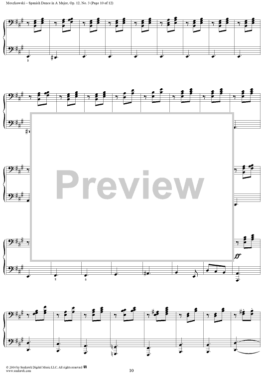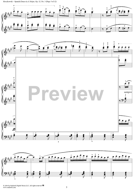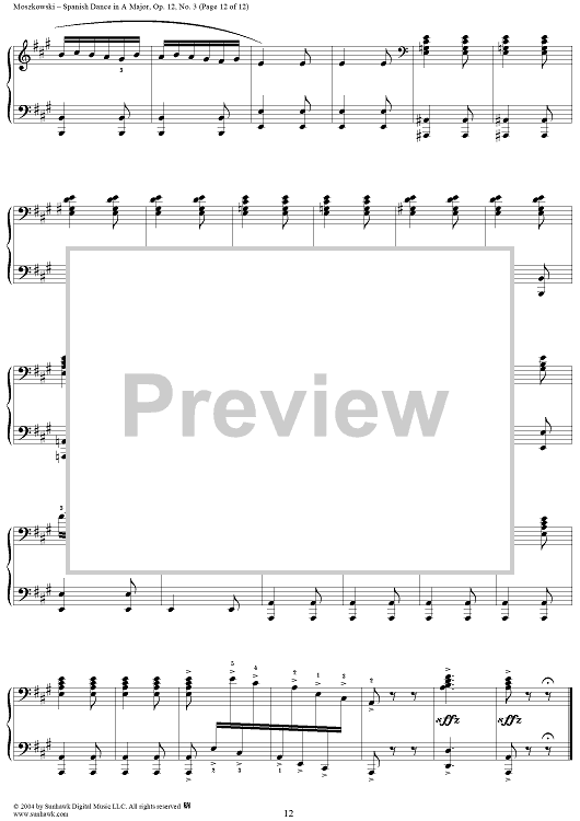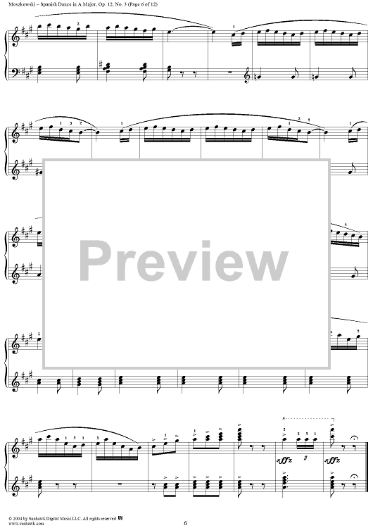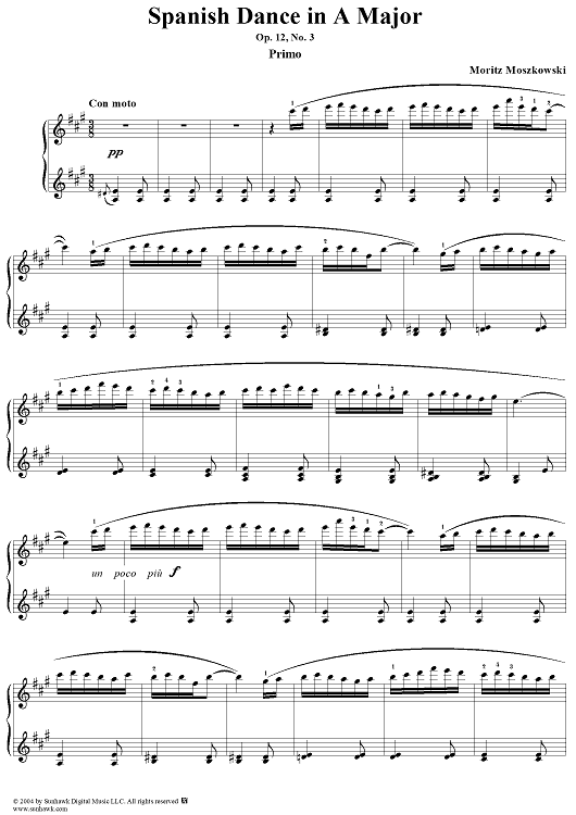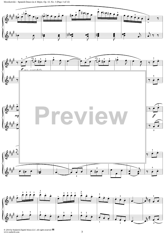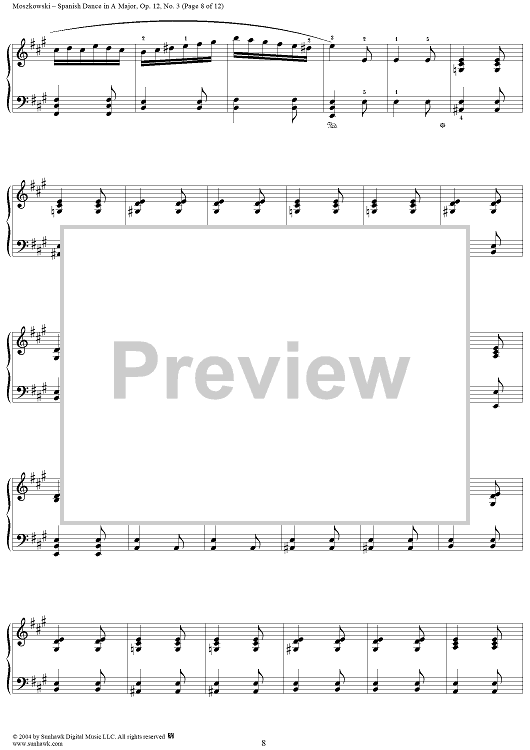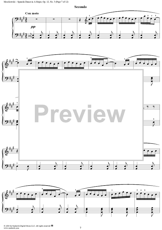 Digital Sheet Music for Spanish Dance in A Major, Op. 12, No. 3 by Moritz Moszkowski scored for 1 Piano, 4 Hands; id:296759