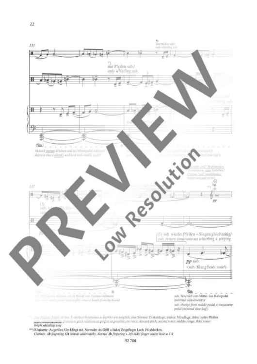 Der "normale" Tastatur-Klavierklang bleibt in diesem Stück die Ausnahme, in der Singstimme wird auf Text weitgehend verzichtet und die Klarinettenstimme ist übersät mit Luft- und Mehrklängen.