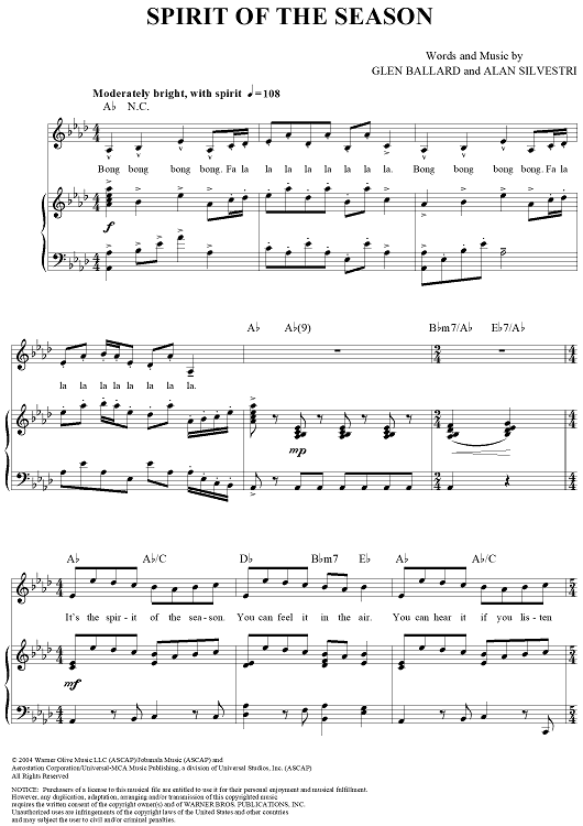 Digital Sheet Music for Spirit of the Season by Glen Ballard, Alan Silvestri scored for Piano Solo; id:307895