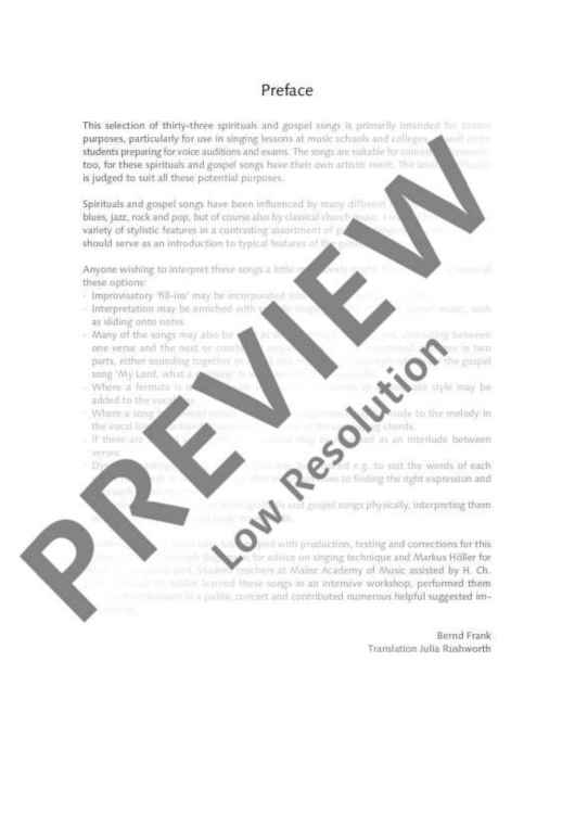 This edition is suitable for lessons and for preparing for entrance exams in the subsidiary subject of singing for school or church music as well as for concert performances. The pieces impart the specific techniques of gospel singing.