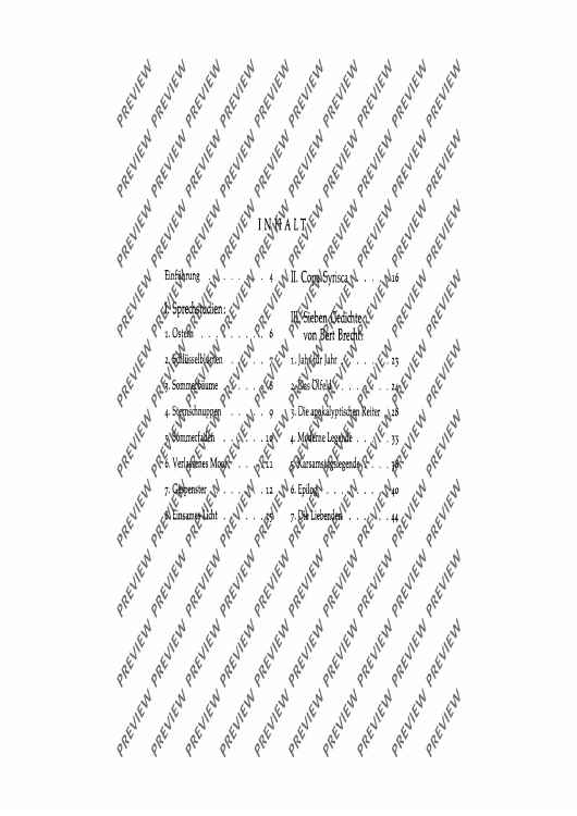 Diese Sammlung setzt die "Stücke für Sprechchor" auf einer neuen Stilstufe fort. Nach einer Folge von bildhaften Sprechstudien nach eigenen Texten steht ein lateinisches Gedicht aus dem Umraum Virgils sowie sieben Gedichte von Bert Brecht. Mit der Einrichtung dieser Gedichte, die man laut Orff weder singen noch in üblicher Manier sprechen kann, sondern interpretieren muss, verwirklicht der Komponist seine Grundintention, die Musik in die Sprache hereinzuholen, ohne deren Autonomie aufzuheben.