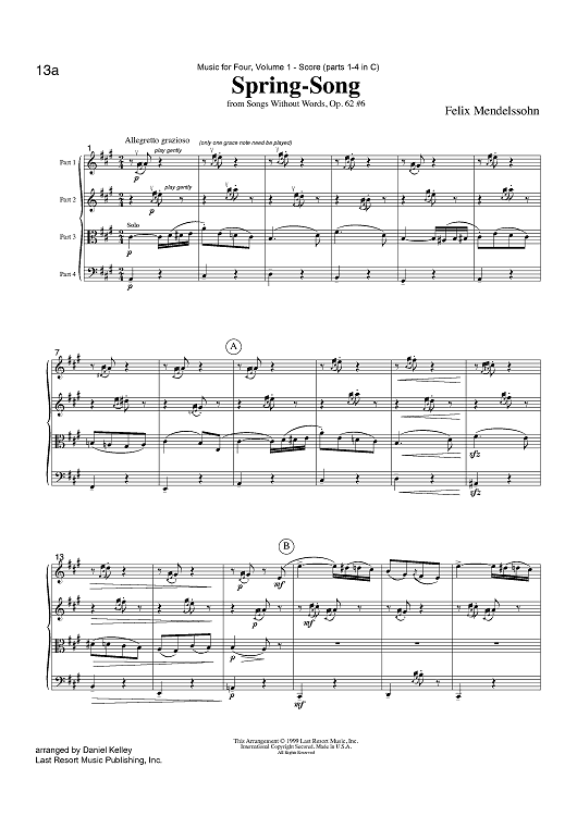 Digital Sheet Music for Spring-Song - from Songs Without Words, Op. 62 #6 - Score by , Felix Mendelssohn, Daniel Kelley scored for Instrumental Quartet; id:423577