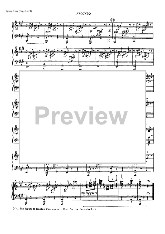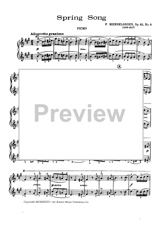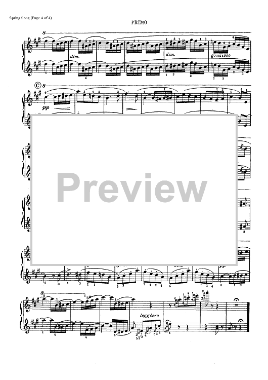 Digital Sheet Music for Spring Song by Felix Mendelssohn scored for 1 Piano, 4 Hands; id:460759