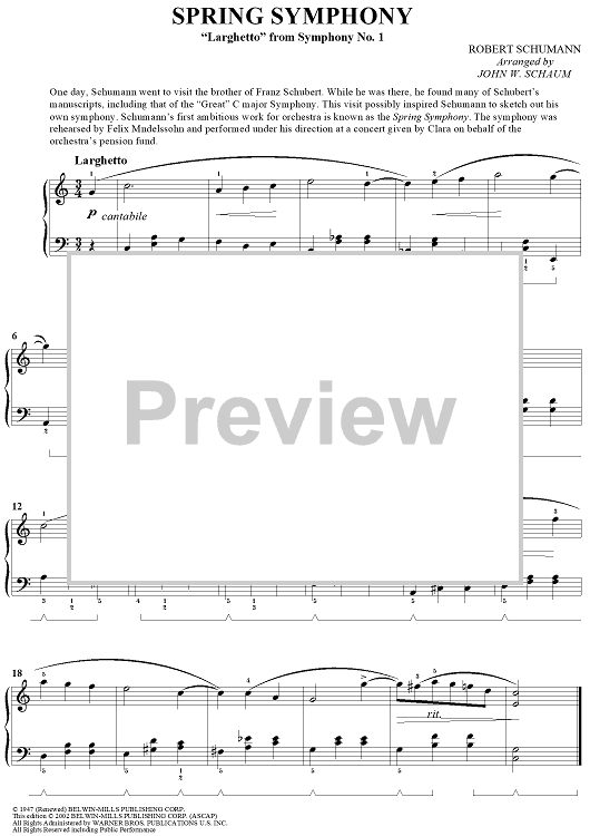 Digital Sheet Music for Spring Symphony ("Larghetto" from Symphony No. 1) by John W. Schaum, Robert Schumann scored for Piano Solo; id:296151