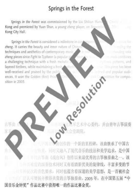 Springs in the Forest is considered a milestone in contemporary Chinese composition for zheng. It carries the beauty and inner nature of Chinese classical music while blending the techniques and aesthetics of contemporary music, and is one of the most outstanding solo zheng pieces since Fight to Typhoon (a popular piece from the seventies). The work combines a challenging technique with a fresh melodic line, rich and varied rhythmic patterns, and layered timbres, while maintaining a fresh aesthetic vision at same time. This piece has been well-received and praised by the public, and is suited for both refined and popular audiences. It won the Golden (first) Prize in China's Fifth Golden Bell Competition for composition in 2005.