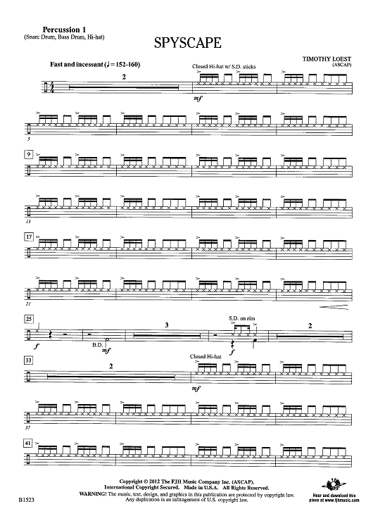 Digital Sheet Music for Spyscape - Percussion 1 by Timothy Loest scored for Concert Band; id:440019