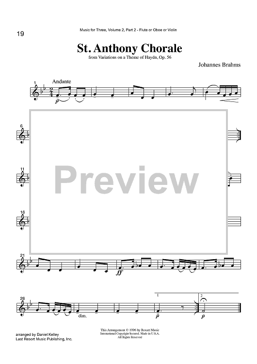 Digital Sheet Music for St. Anthony Chorale - from Variations on a Theme of Haydn, Op. 56 - Part 2 Flute, Oboe or Violin by , Johannes Brahms, Daniel Kelley scored for Instrumental Trio; id:422640