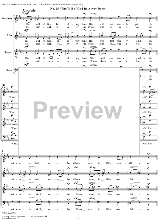 Digital Sheet Music for St. Matthew Passion: Part I, No. 25, "The Will of God Be Always Done" by Johann Sebastian Bach scored for Four-part Mixed Chorus; id:304933