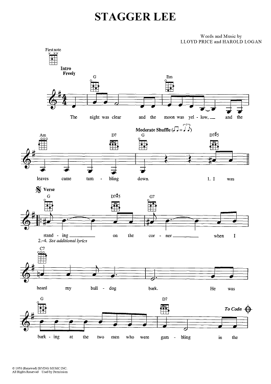 Digital Sheet Music for Stagger Lee by Lloyd Price, Harold Logan scored for Ukulele/Vocal; id:447375