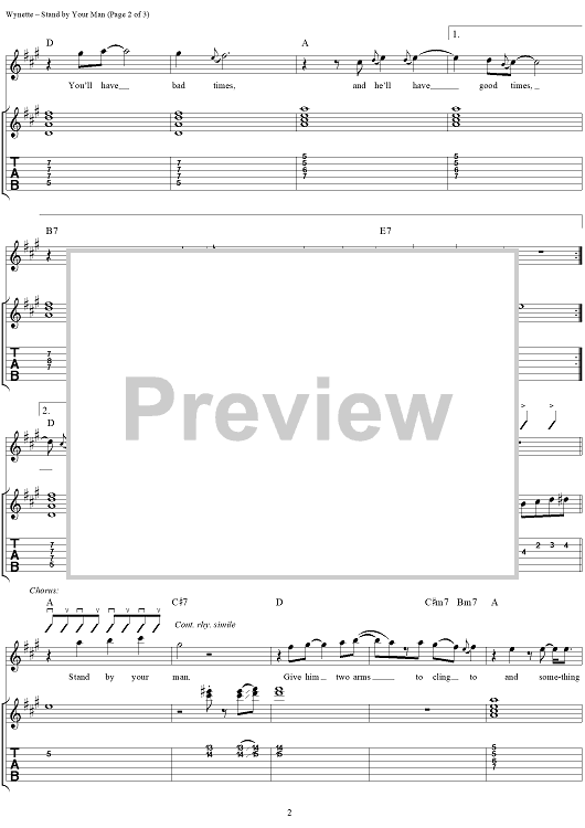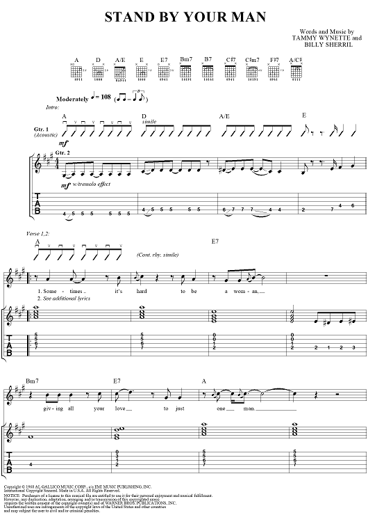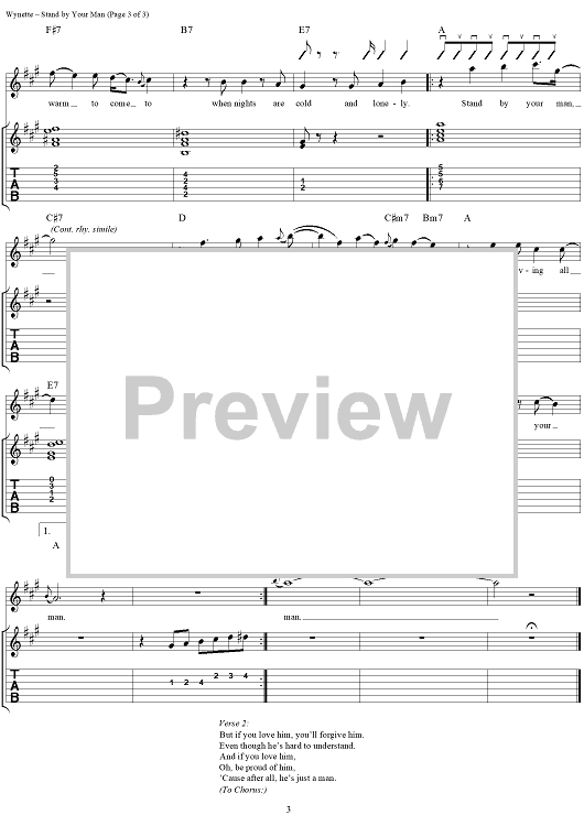 Digital Sheet Music for Stand By Your Man by Tammy Wynette, Kenn Chipkin, Billy Sherrill scored for Guitar Tab/Vocal; id:114119