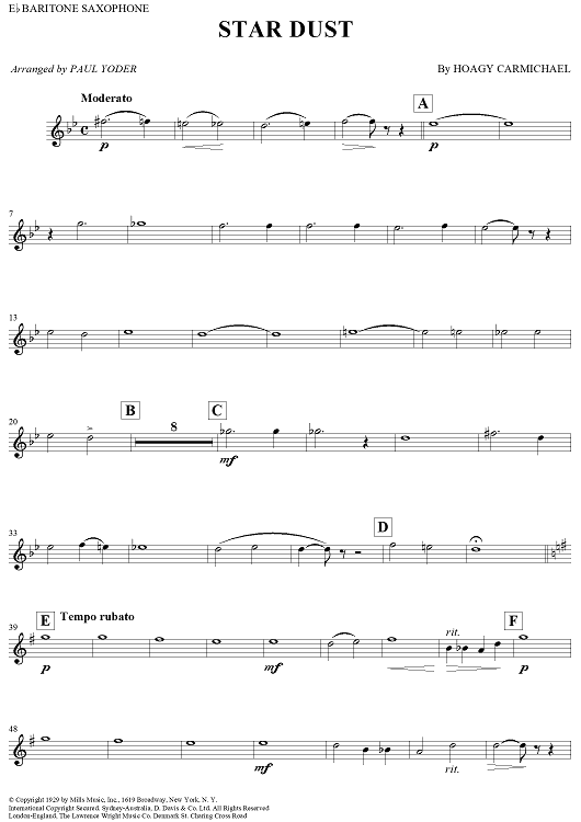 Digital Sheet Music for Star Dust - Baritone Saxophone by Hoagy Carmichael, Paul Yoder scored for Concert Band; id:272910