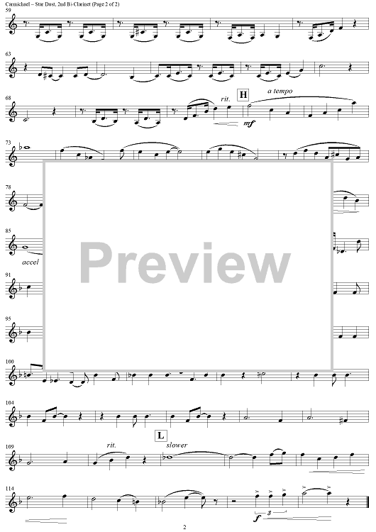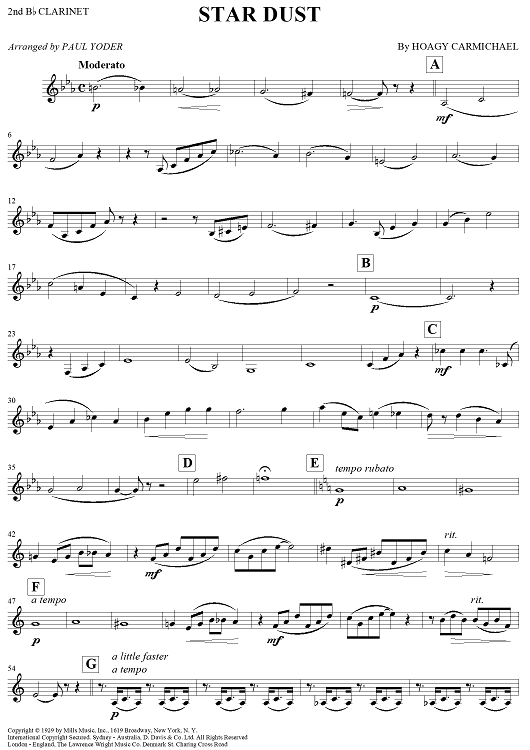 Digital Sheet Music for Star Dust - Clarinet 2 by Hoagy Carmichael, Paul Yoder scored for Concert Band; id:272911