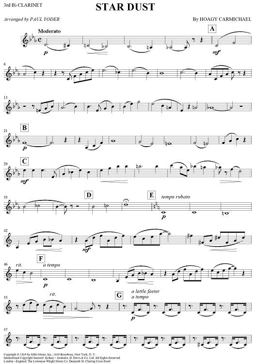 Digital Sheet Music for Star Dust - Clarinet 3 by Hoagy Carmichael, Paul Yoder scored for Concert Band; id:272912