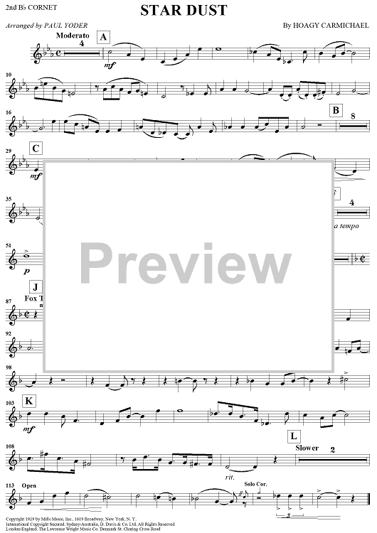 Digital Sheet Music for Star Dust - Cornet 2 by Hoagy Carmichael, Paul Yoder scored for Concert Band; id:272948