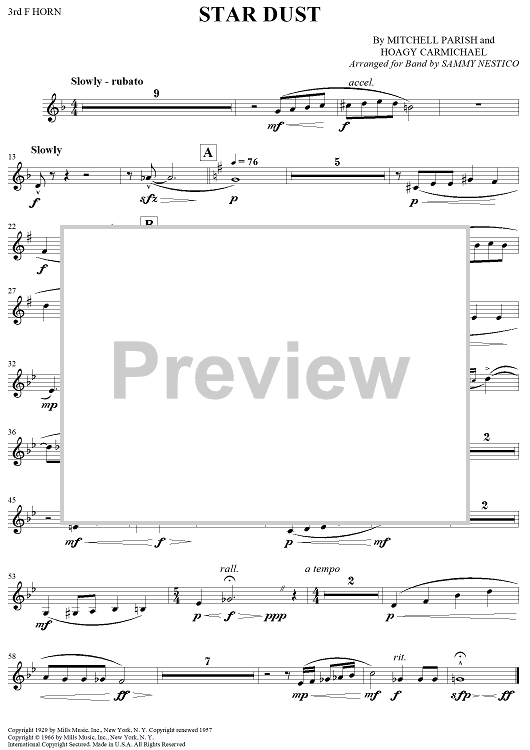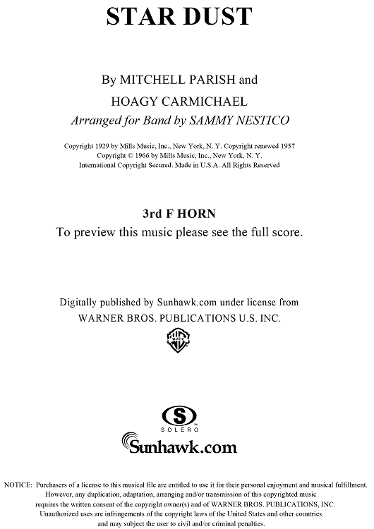 Digital Sheet Music for Star Dust - Horn in F 3 by Mitchell Parish, Hoagy Carmichael, Sammy Nestico scored for Concert Band; id:254274