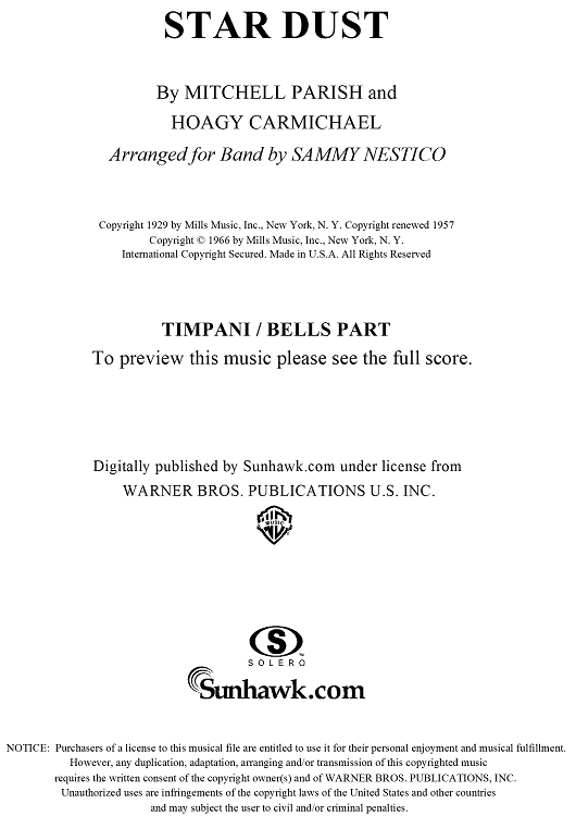 Digital Sheet Music for Star Dust - Timpani / Bells by Mitchell Parish, Hoagy Carmichael, Sammy Nestico scored for Concert Band; id:254288