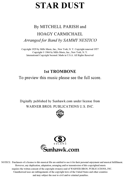 Digital Sheet Music for Star Dust - Trombone 1 by Mitchell Parish, Hoagy Carmichael, Sammy Nestico scored for Concert Band; id:254174