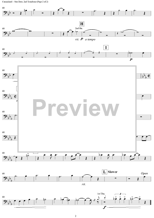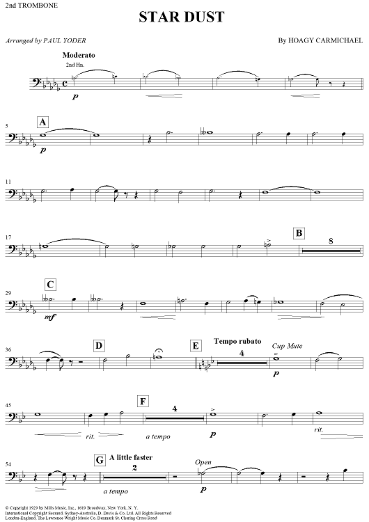 Digital Sheet Music for Star Dust - Trombone 2 by Hoagy Carmichael, Paul Yoder scored for Concert Band; id:272947