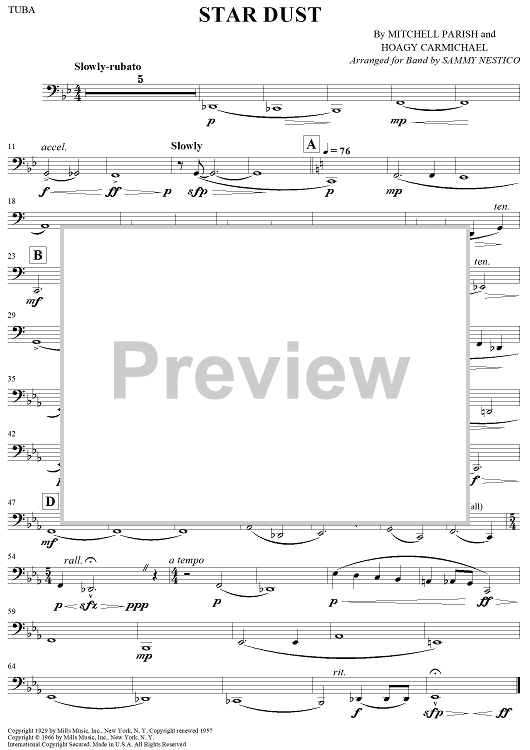 Digital Sheet Music for Star Dust - Tuba by Mitchell Parish, Hoagy Carmichael, Sammy Nestico scored for Concert Band; id:254285