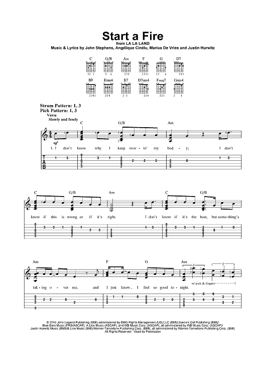 Digital Sheet Music for Start A Fire - from La La Land by John Legend, Justin Hurwitz, Angelique Cinelu, Marius De Vries scored for Easy Guitar Tab/Vocal; id:463912