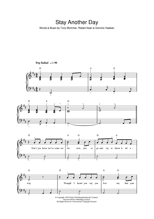 Digital Sheet Music for Stay Another Day by East 17, Dominic Hawken, Tony Mortimer, Rob Kean scored for Piano/Vocal/Chords; id:393487
