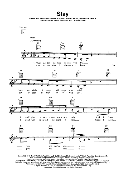 Digital Sheet Music for Stay by Tim Rice, Anton Zaslavski, Zedd, Jonnali Parmenius, Alessia Caracciolo, Alessia Cara, Anders Froen, Sarah Aarons, Linus Wiklund scored for Ukulele/Vocal; id:465759