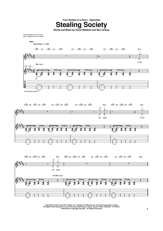 Digital Sheet Music for Stealing Society by Daron Malakian, System Of A Down, Serj Tankian scored for Guitar Tab; id:389432
