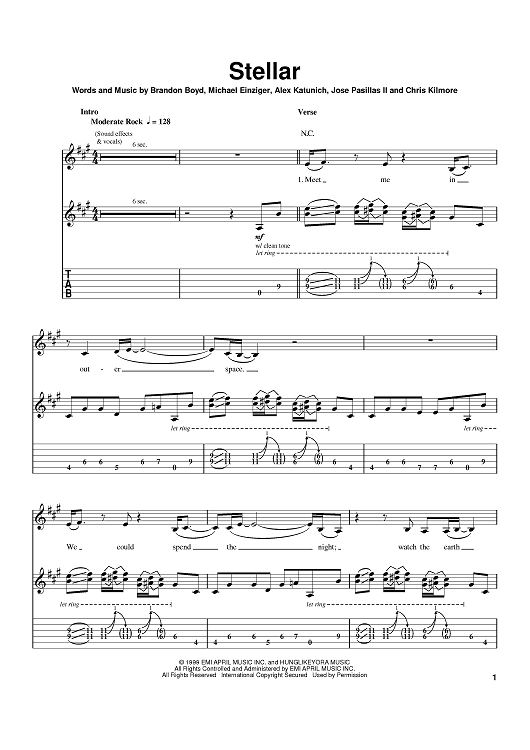 Digital Sheet Music for Stellar by Brandon Boyd, Mike Einziger, Incubus, Alex Katunich, Chris Kilmore, José Antonio Pasillas II scored for Easy Guitar Tab; id:382069