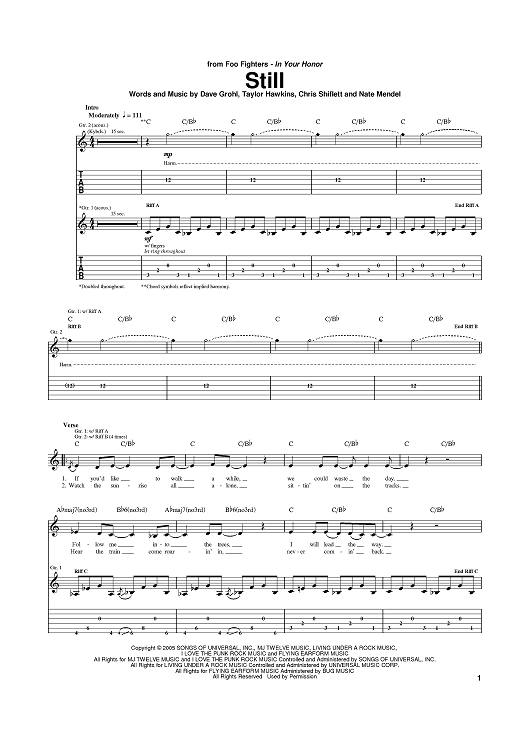 Digital Sheet Music for Still by Foo Fighters, Dave Grohl, Taylor Hawkins, Nate Mendel, Chris Shiflett scored for Guitar Tab; id:386768