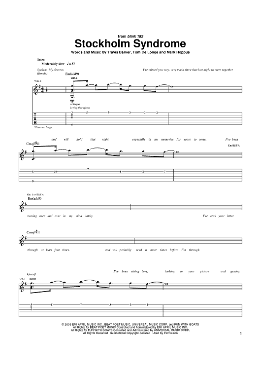 Digital Sheet Music for Stockholm Syndrome by Travis Barker, Mark Hoppus, blink-182, Tom DeLonge scored for Guitar Tab; id:373358