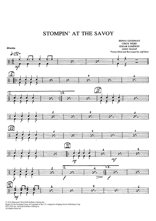 Digital Sheet Music for Stompin' At The Savoy - Drums by , Chick Webb, Benny Goodman, Andy Razaf, Edgar Sampson, Jeff Hest scored for Jazz Ensemble; id:456288