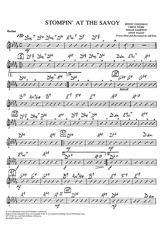 Digital Sheet Music for Stompin' At The Savoy - Guitar by , Chick Webb, Benny Goodman, Andy Razaf, Edgar Sampson, Jeff Hest scored for Jazz Ensemble; id:456285