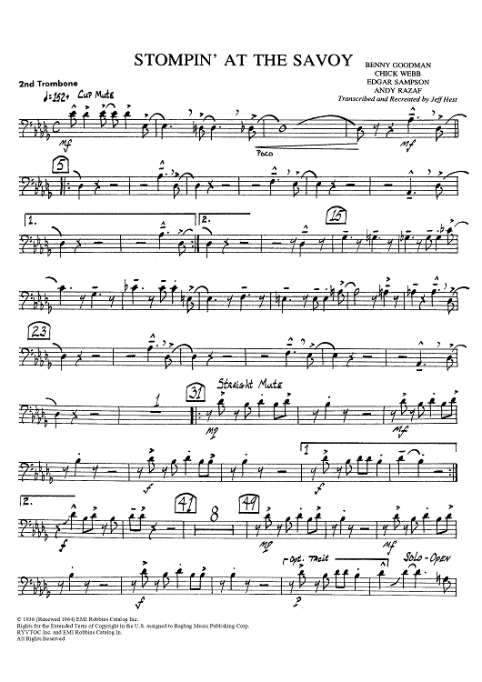 Digital Sheet Music for Stompin' At The Savoy - Trombone 2 by , Chick Webb, Benny Goodman, Andy Razaf, Edgar Sampson, Jeff Hest scored for Jazz Ensemble; id:456284