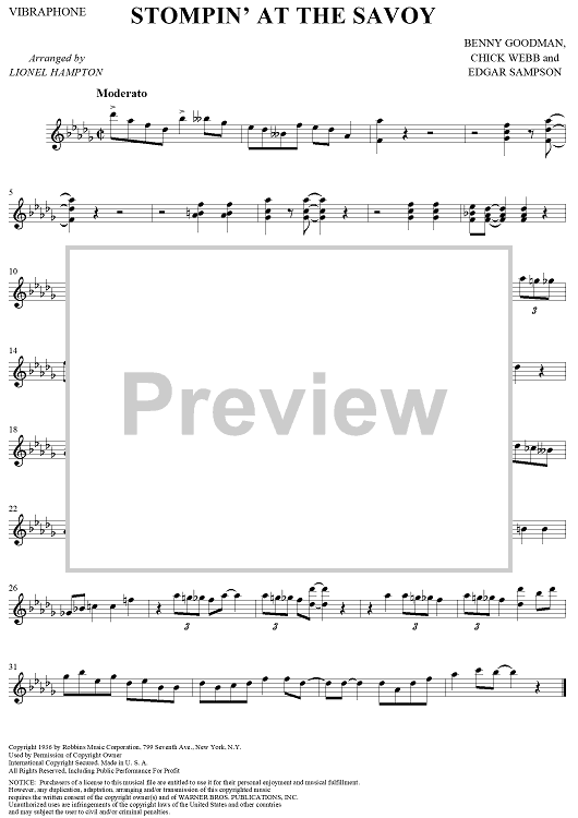 Digital Sheet Music for Stompin' At The Savoy - Vibraphone by , Chick Webb, Benny Goodman, Edgar Sampson, Lionel Hampton scored for Vibraphone/Piano; id:313740
