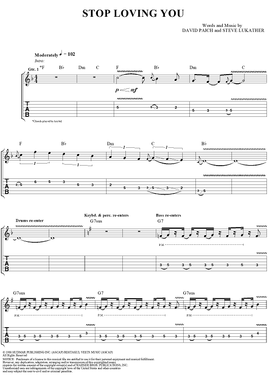 Digital Sheet Music for Stop Loving You by Toto, David Paich, Steve Lukather scored for Guitar Tab/Vocal; id:120105