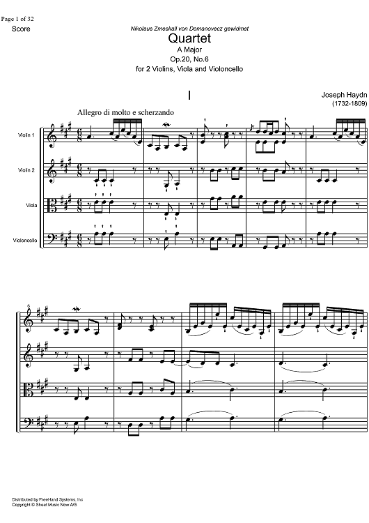 Digital Sheet Music for String Quartet A Major Op.20 No. 6 - Score by Franz Joseph Haydn scored for String Quartet; id:326503