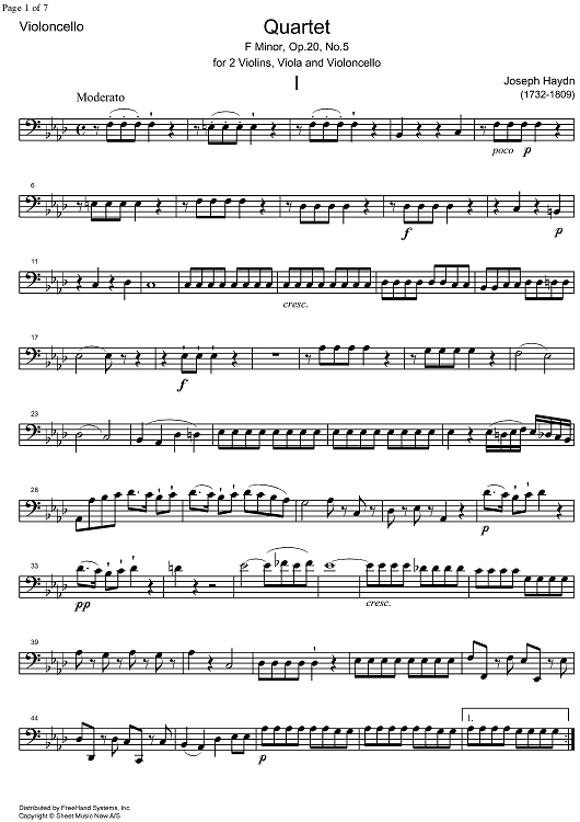 "String Quartet f minor Op.20 No. 5 - Cello" Sheet Music by Franz Joseph Haydn