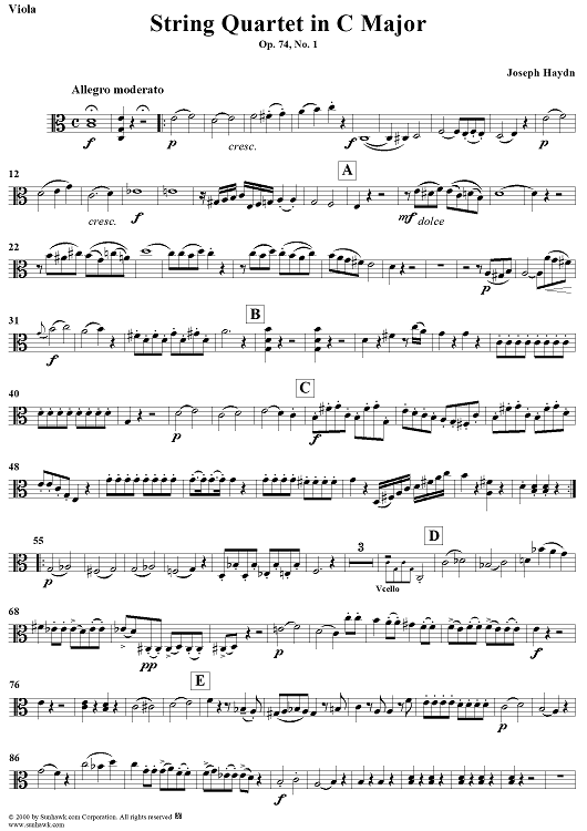 "String Quartet in C Major, Op. 74, No. 1 - Viola" Sheet Music by Franz Joseph Haydn