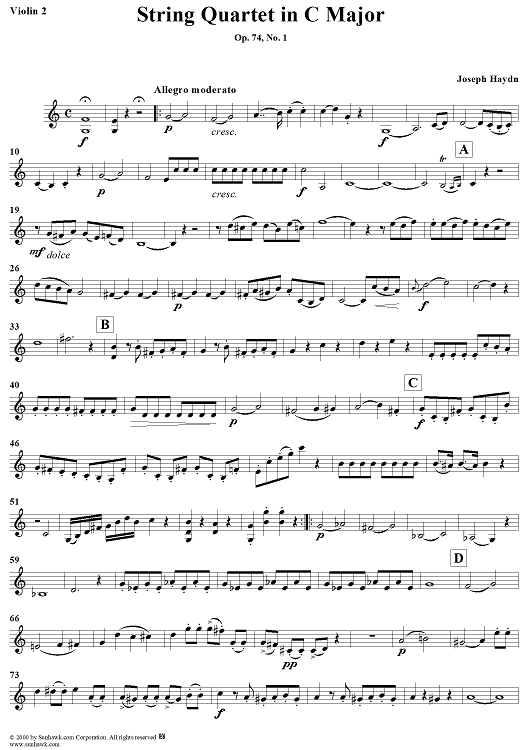 "String Quartet in C Major, Op. 74, No. 1 - Violin 2" Sheet Music by Franz Joseph Haydn