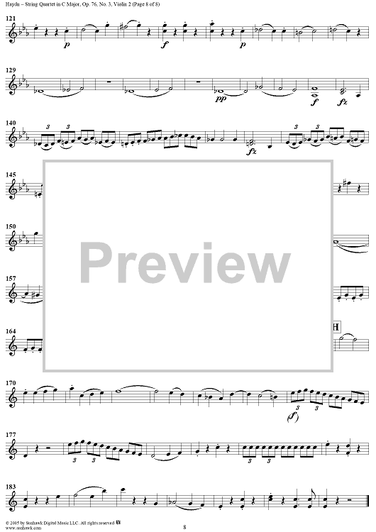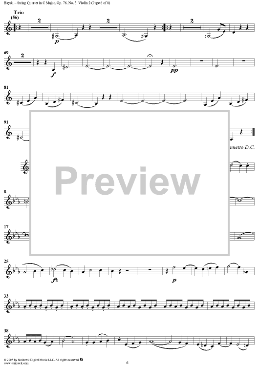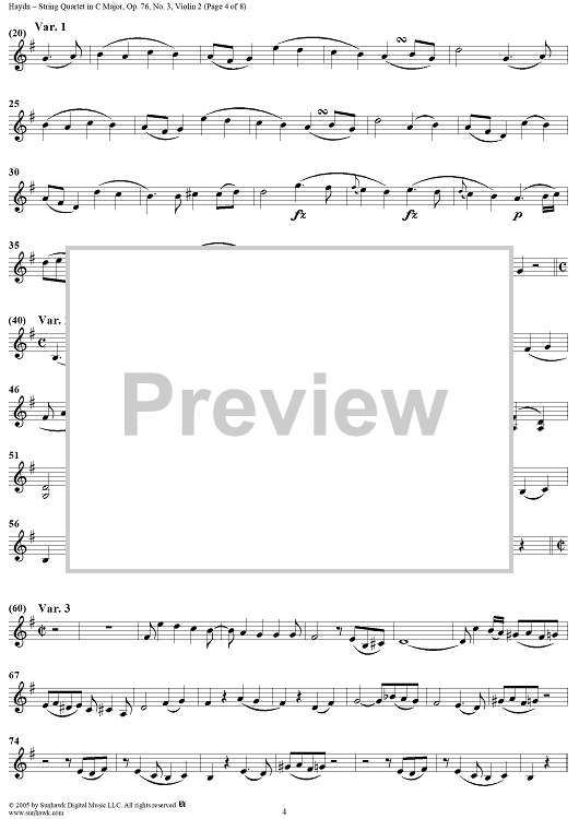 Digital Sheet Music for String Quartet in C Major, Op. 76, No. 3 - Violin 2 by Franz Joseph Haydn scored for String Quartet; id:310581