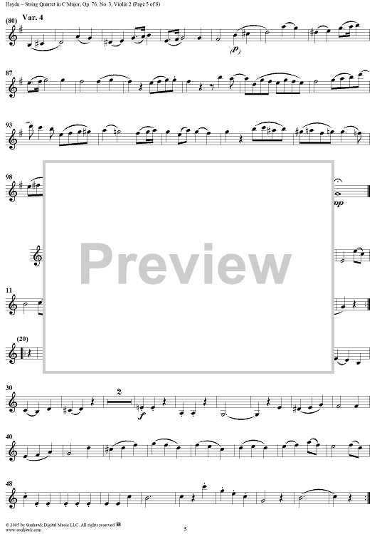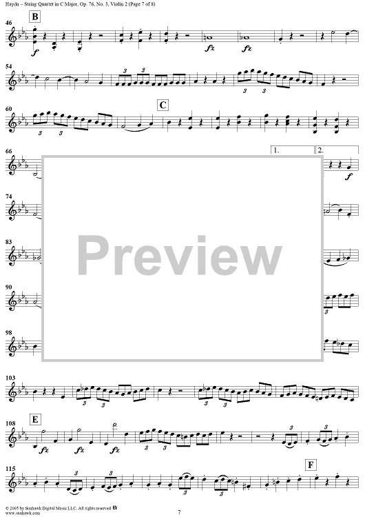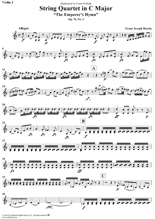 "String Quartet in C Major, Op. 76, No. 3 - Violin 2" Sheet Music by Franz Joseph Haydn