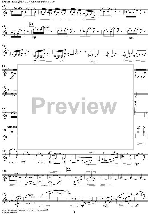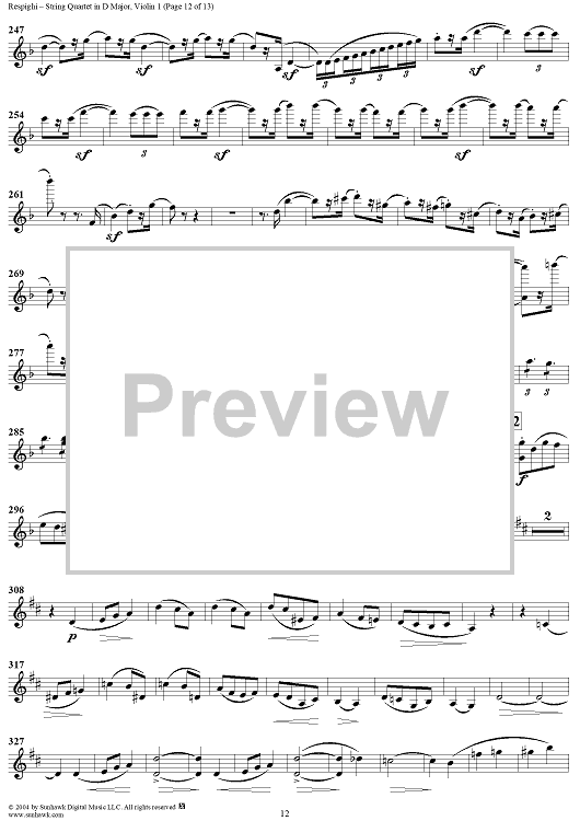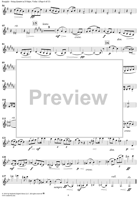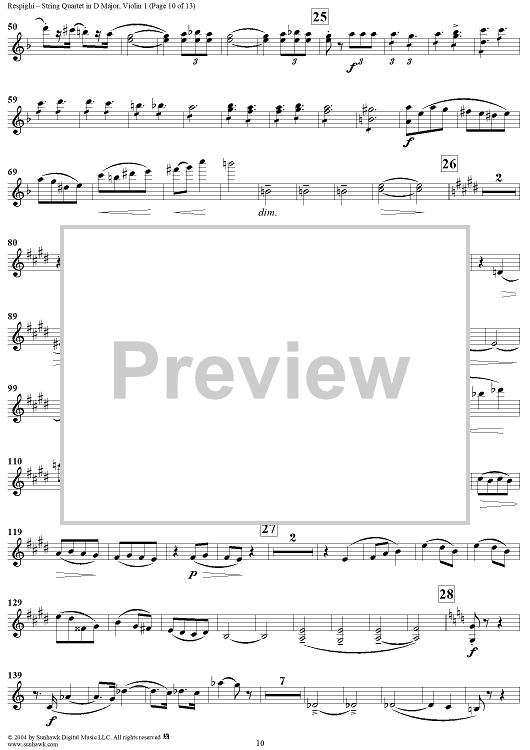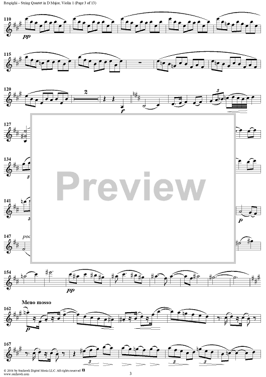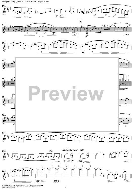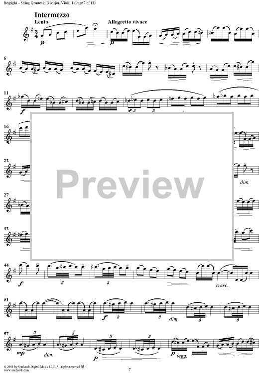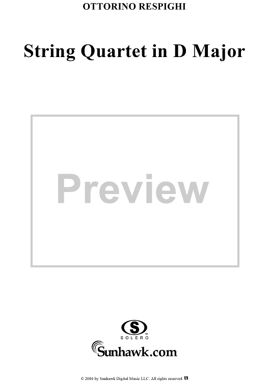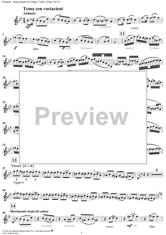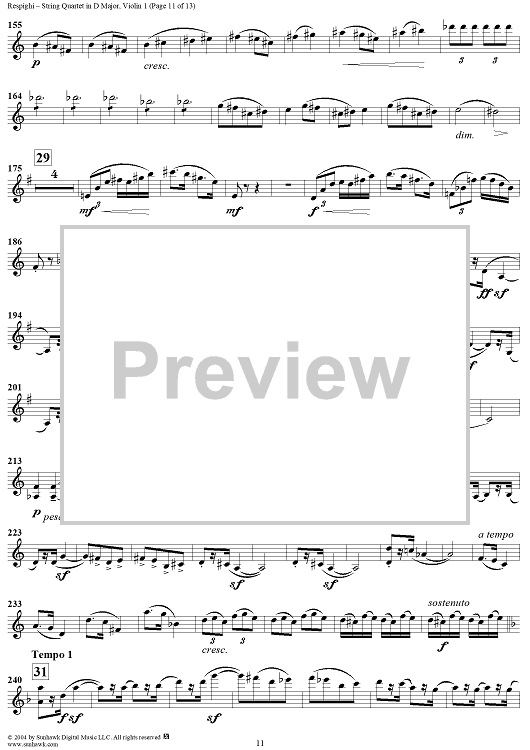 Digital Sheet Music for String Quartet in D Major - Violin 1 by Ottorino Respighi scored for String Quartet; id:303729
