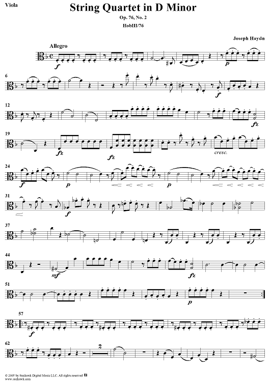 "String Quartet in D Minor, Op. 76, No. 2 - Viola" Sheet Music by Franz Joseph Haydn