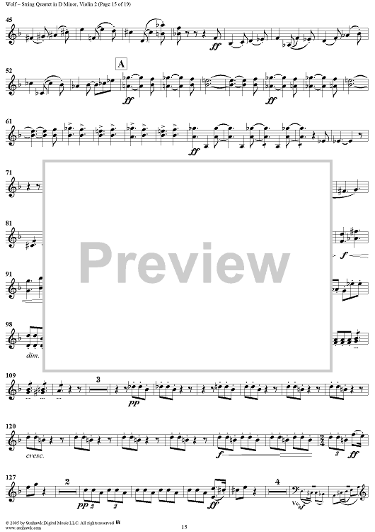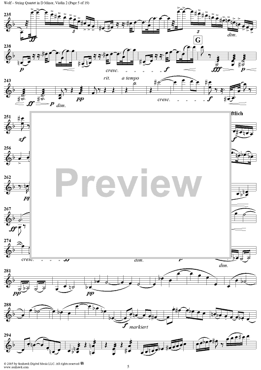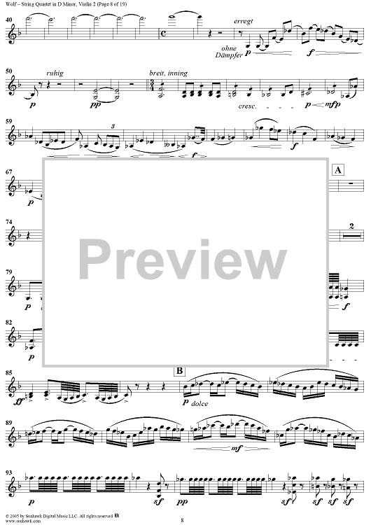 "String Quartet in D Minor - Violin 2" Sheet Music by Hugo Wolf