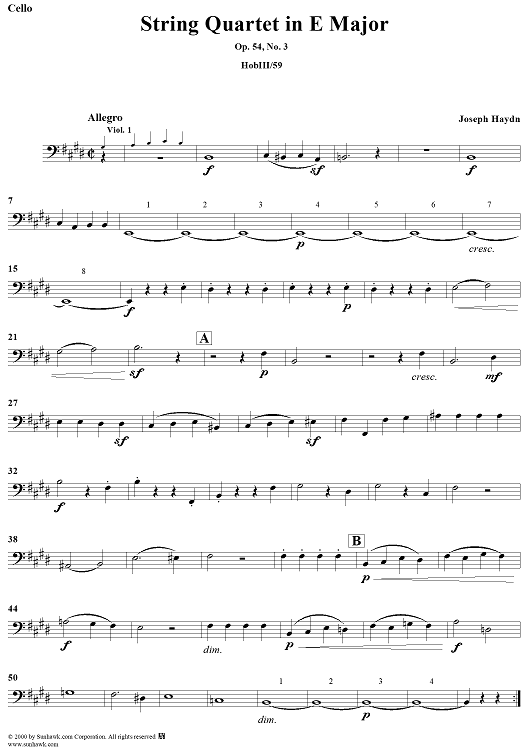 "String Quartet in E Major, Op. 54, No. 3 - Cello" Sheet Music by Franz Joseph Haydn