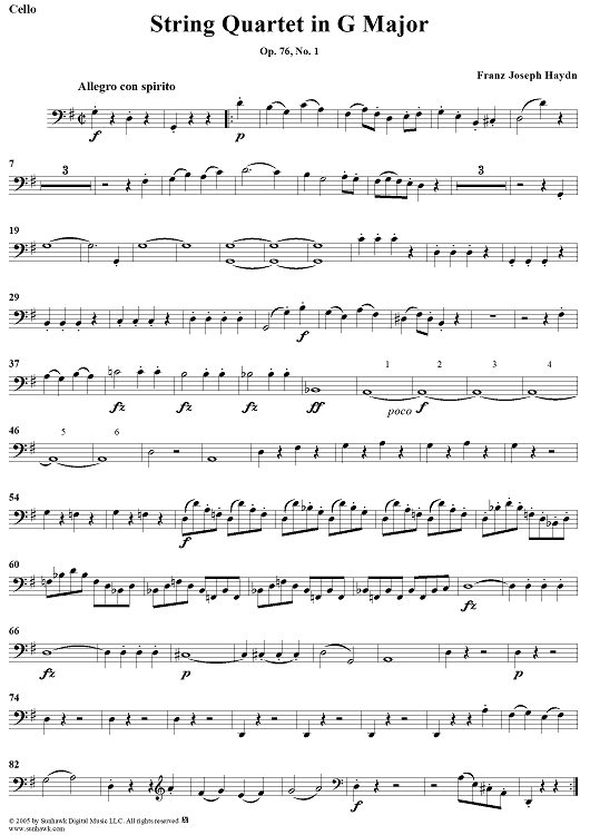 "String Quartet in G Major, Op. 76, No. 1 - Cello" Sheet Music by Franz Joseph Haydn
