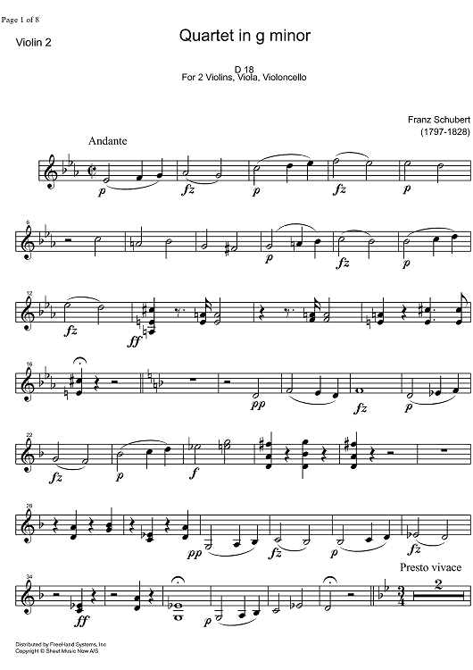 Digital Sheet Music for String Quartet No. 1 g minor D18 - Violin 2 by Franz Schubert scored for String Quartet; id:325859